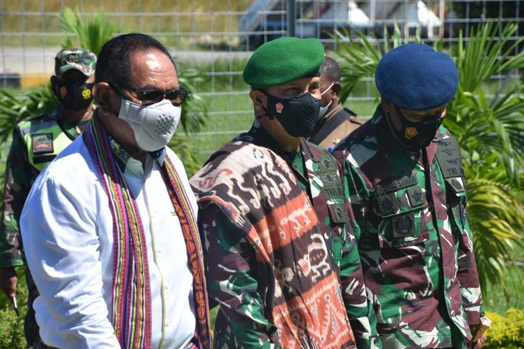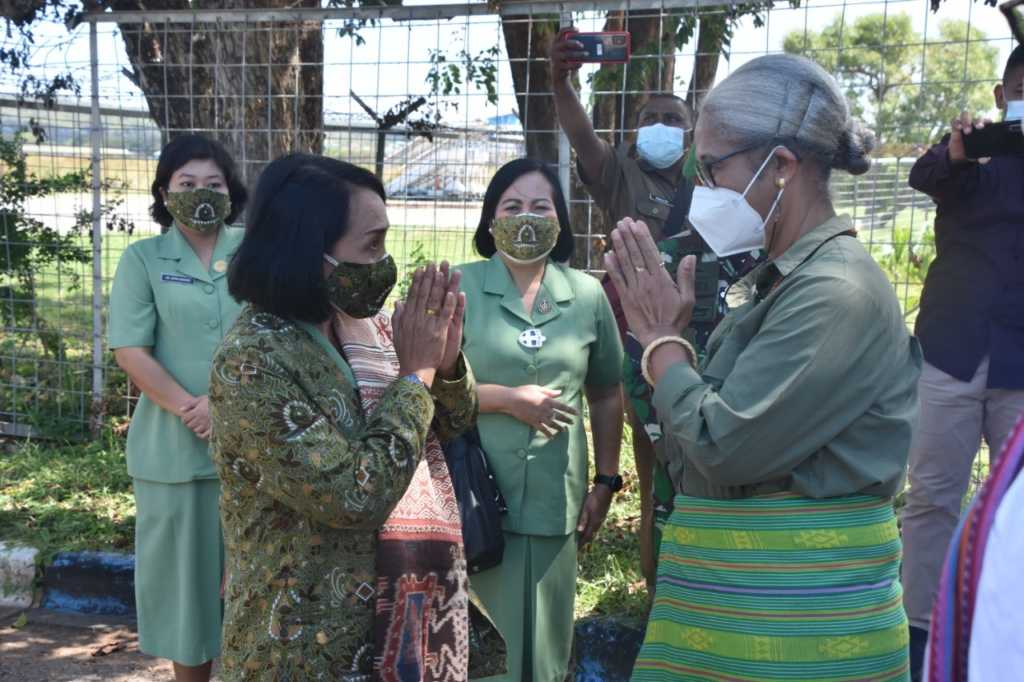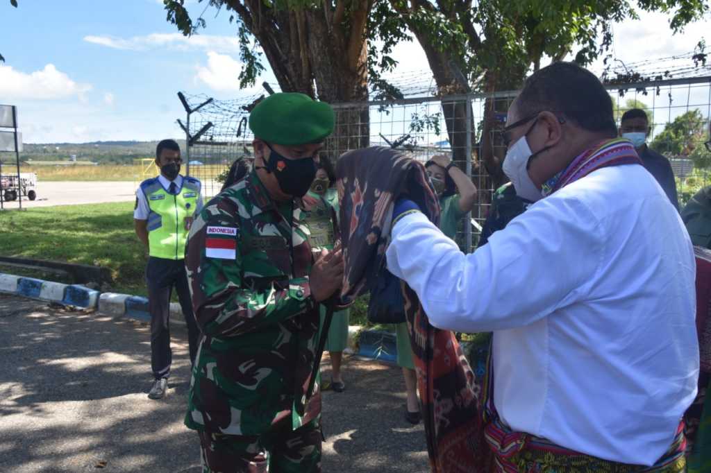 Danrem 161/Wira Sakti Brigjen TNI Legowo WR Jatmiko,S.I.P.,M.M beserta ibu dan Brigjen TNI Samuel Petrus Hehakaya beserta ibu, tiba di VIP Room Pemda Bandara El Tari Kupang kurang lebih pukul 13.15 Wita, selanjutnya disambut pengalungan Kain Tais oleh Wakil Gubernur NTT, Yoseph Nae Soi.