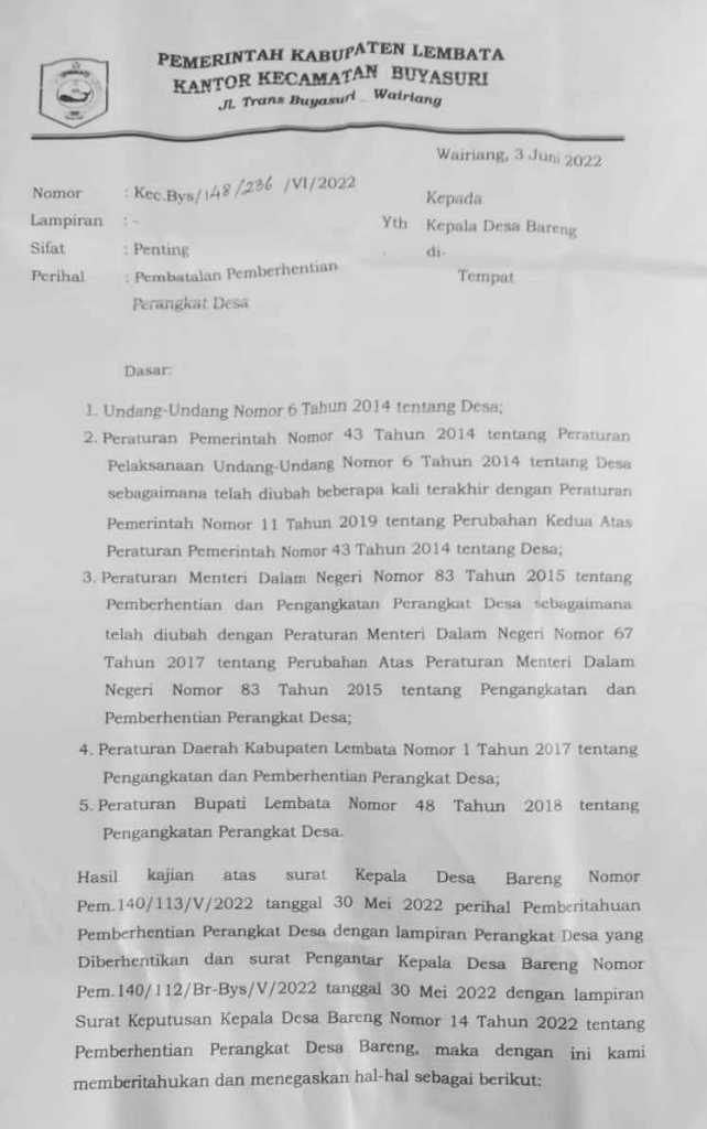 Terhadap Surat Keputusan Kepala Desa Bareng nomor 14 Tahun 2022 tersebut Camat Buyasuri Lambertus Carkes, S.H, melalui surat Camat Nomor:Kec.Bys/148/236/VI/2022 tanggal 3 Juni 2022, perihal Pembatalan Pemberhentian Perangkat Desa, yang ditujukan kepada Kepala Desa Bareng. hal ini kemudian jadi polemik yang serius dan cukup menegangkan di Desa Bareng hingga saat ini.