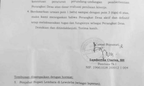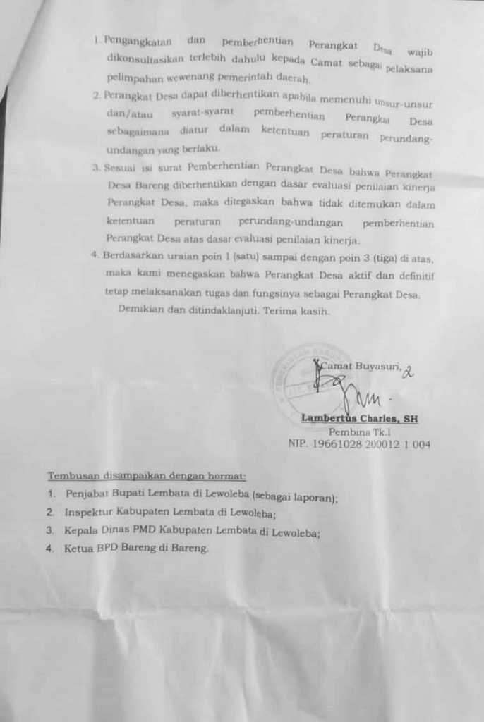 Polemik ini mendapat penilaian dari Direktur LBH SIKAP Lembata Juprians Lamablawa, SH. MH berpandangan bahwa, secara normatif Surat Keputusan Kepala Desa adalah Keputusan Pejabat Tata Usaha Negara _beschikking_ menurut asas _contrasius actus_ dalam Hukum Adminustrasi Negara,_beschikking_ atau Keputusan Tata Usaha Negara hanya boleh dibatalkan oleh Pejabat Tata Usaha Negara yang mengeluarkan Keputusan itu sendiri atau atas perintah putusan Pengadilan Tata Usaha Negara yang telah berkekuatan hukum tetap.