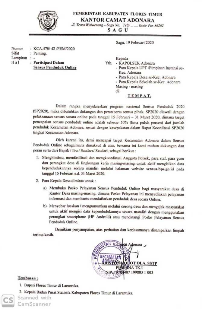 Hal yang sama juga dilakukan oleh camat Adonara, Ariston Kolot Ola, SSTP. Dalam suratnya yang bernomor KCA.470/42/PEM/2020 perihal Partisipasi dalam SP Online menegaskan kepada seluruh anggota TNI Polri, Para Guru, Pegawai, Aparat Desa agar aktif mengisikan data penduduk secara online melalui alamat url : sensus.bps.go.id.