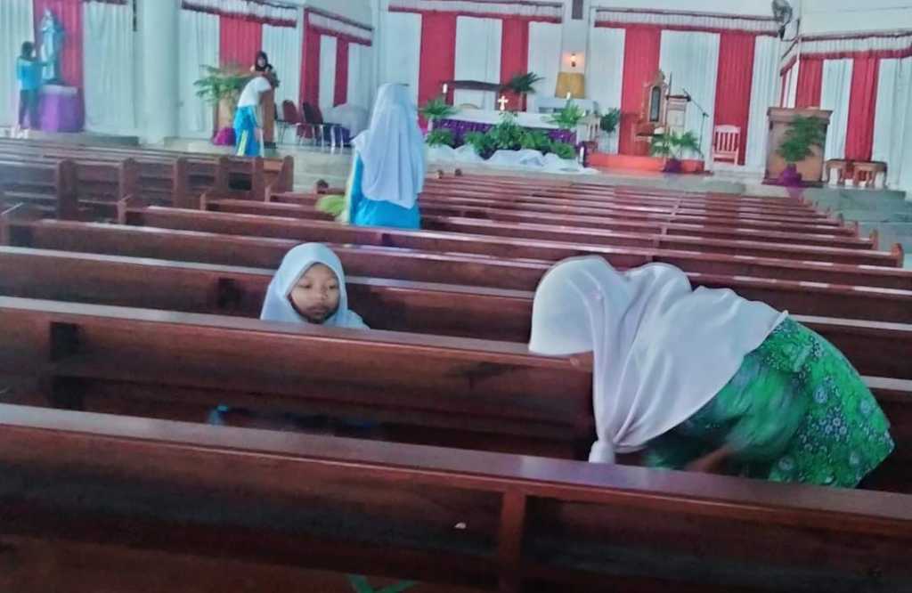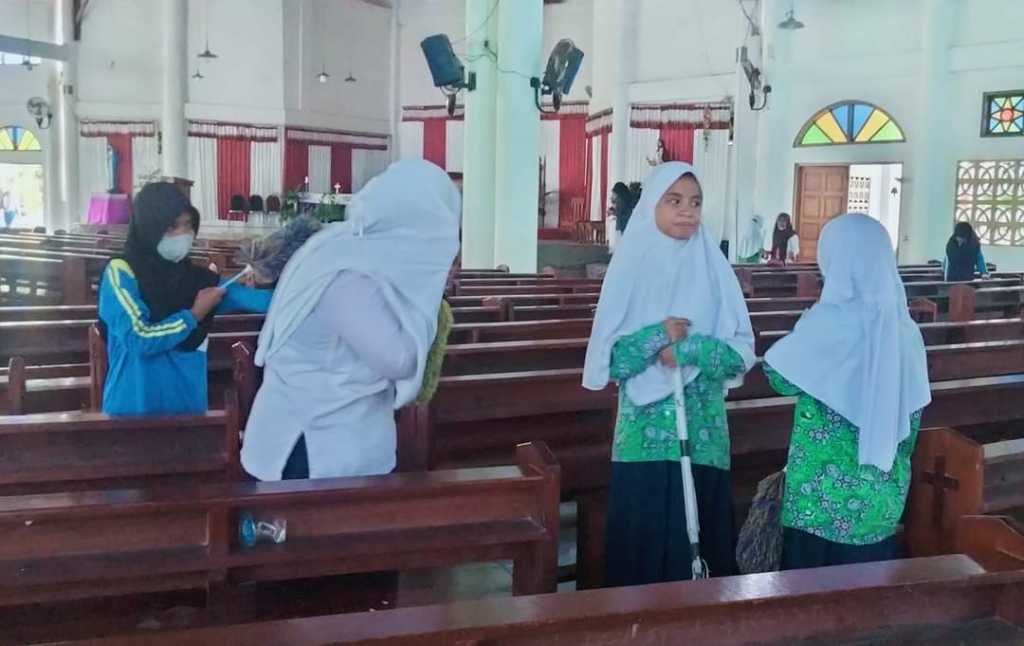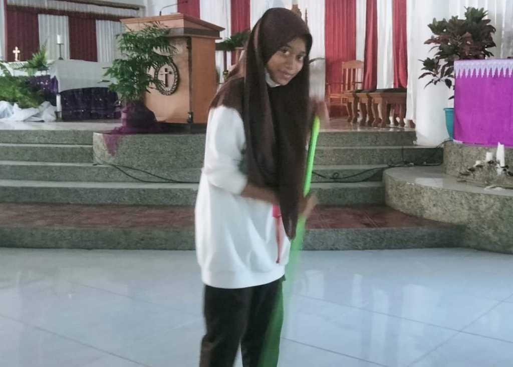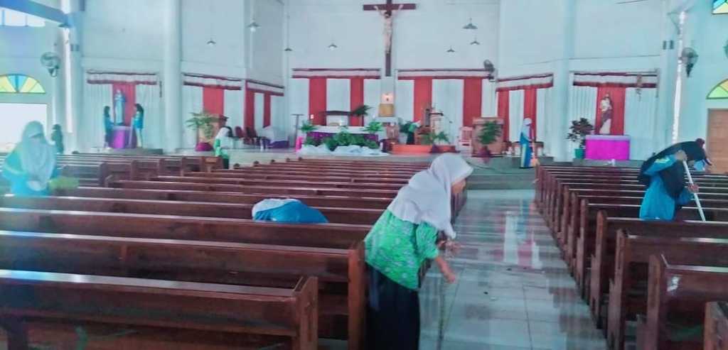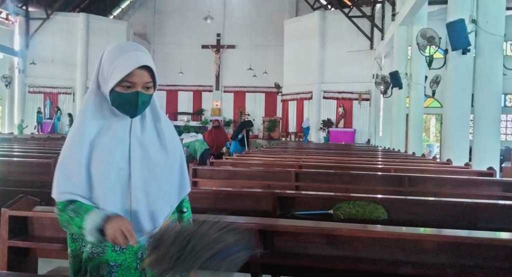 Menurut Bediona, ini pemandangan yang luar biasa, Altar dan bagian dalam Gereja dibersihkan putri-putri berjilbab. Sedangkan anak laki2 mengambil bagian di halaman Gereja.