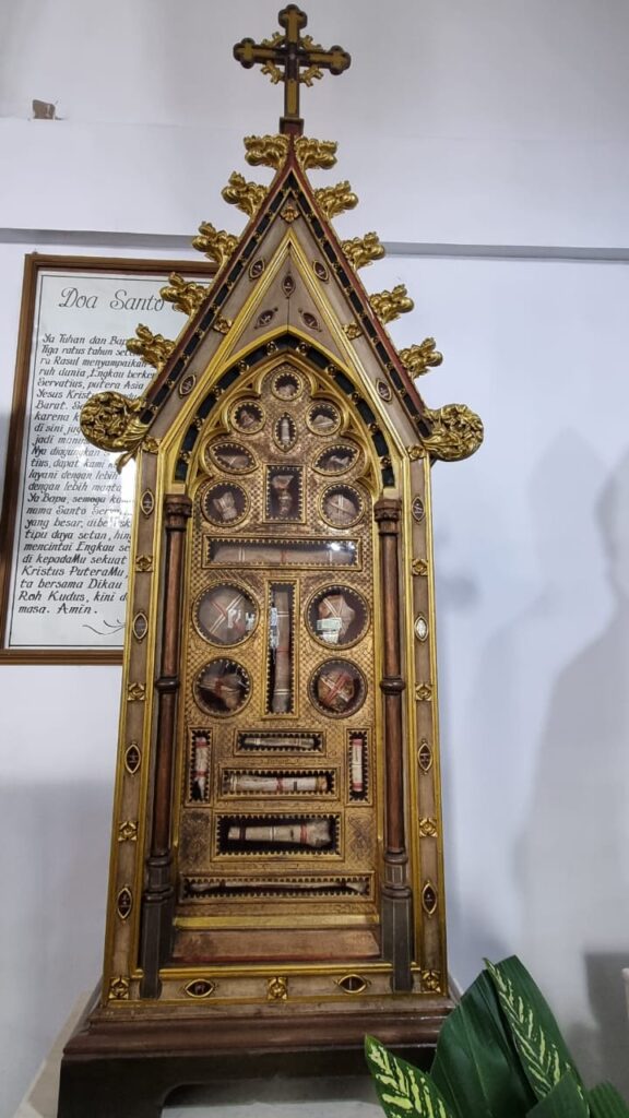 Menurut Pak Bambang yang juga merupakan penduduk asli Kampung Sawah, salah satu keturunan dari 18 orang yang dibaptis tahun 1896, kepada para peziarah menuturkan bahwa “yang paling menarik dan sangat sakral adalah terdapat 2 peti Relikuarium di dalam Gereja. 2 peti Relikuarium ini datang beberapa waktu setelah Relikui St. Servatius diterima oleh umat Paroki Kampung Sawah. Relikui ini merupakan kelas satu, yakni berupa tulang St. Servatius yang seorang misionaris dari Armenia, Asia Barat kemudian menjadi Uskup Tongeren, Belgia. Penyerahan dan penerimaan Relikui St. Servatius ini merupakan berkat yang diterima oleh umat Paroki Kampung Sawah atas faktor kedekatan dengan Basilika Saint Servast di kota Maastrich, Belanda sebuah Gereja yang dibangun di lokasi makam St. Servatius. Pengantaran dan penyerahan Relikui St. Servatius dilakukan oleh Uskup dan 2 Imam dari Maastrich pada 30 September 1996. Kemudiaan diikuti dengan penerimaan 2 Relikuarium berisi puluhan Relikui.