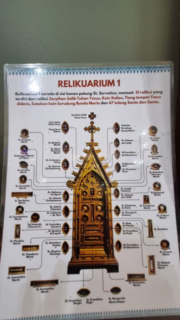Ada pun rangkaian kegiatan yang saya lakukan dalam perjalanan ziarah ini adalah pertama berdoa di pelataran pintu gereja; berdoa di ambang pintu masuk gereja dan menandai diri dengan air suci; berdoa di depan Altar; berdoa di depan Patung Bunda Maria sesuai doa Tahun Yubelium yang telah disusun oleh Bapa Paus Fransiskus. Selain itu saya juga berdoa di depan Patung St. Servatius dan 2 peti Relikuarium yang berada di dalam gereja.
